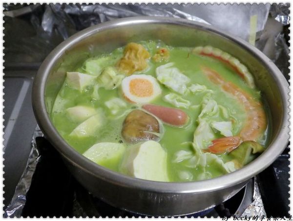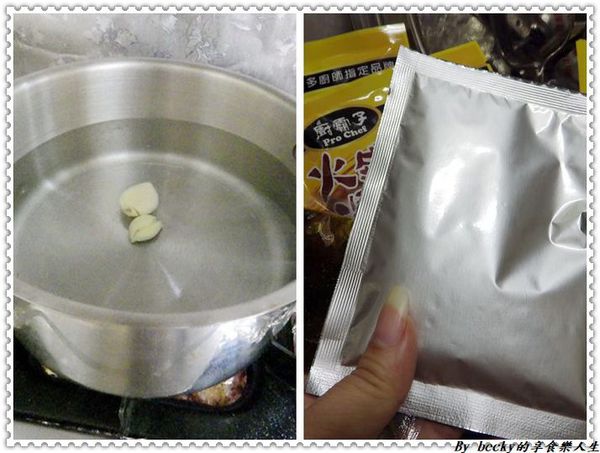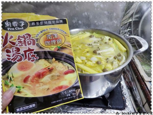 在水中丟入大蒜去提味,然後再打開南洋咖哩包,等水煮後,再把一些食材放入鍋中,就可以熱騰騰的火鍋~