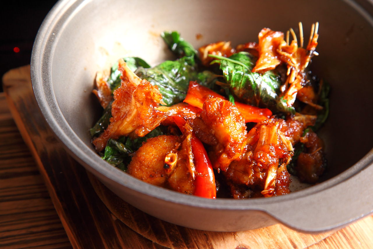 先將鮟鱇魚油炸至金黃色,再與胡麻油、蒜頭、辣椒、薑片、九層塔一起爆炒,鹹香的滋味及紮實的口感,還帶有鮮甜魚香,比起鍋物的美味絲毫不遜色