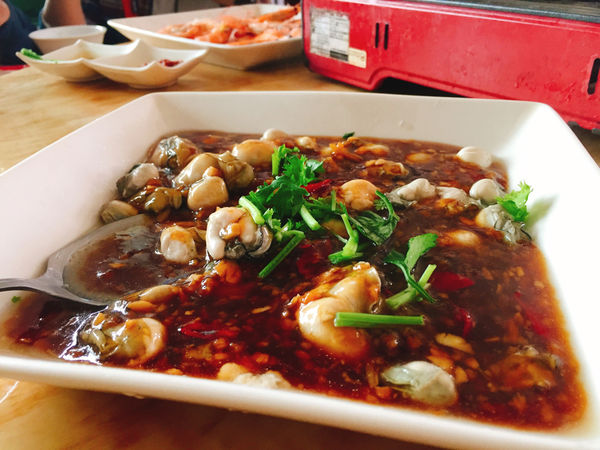 第四道「蚵仔」 看起來煮的很辣其實不然 每一個蚵仔都很大顆 很飽水