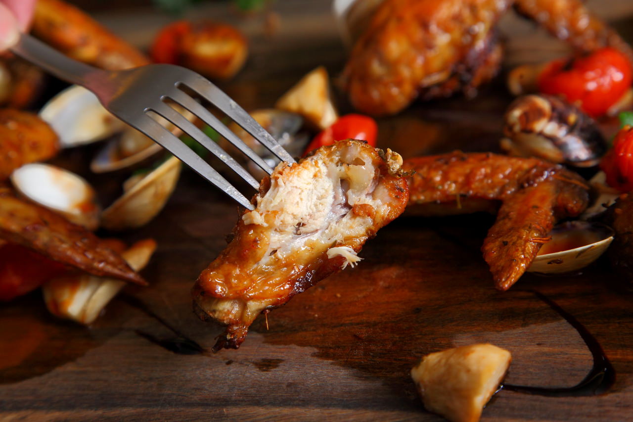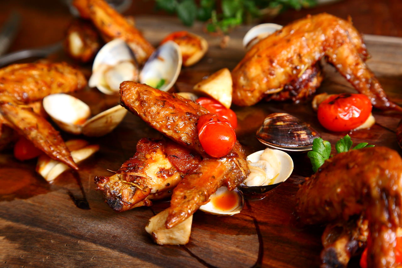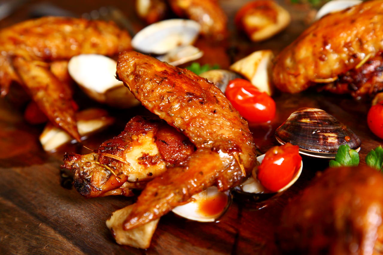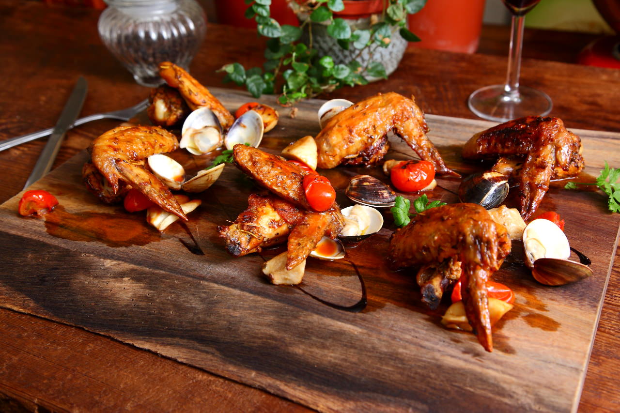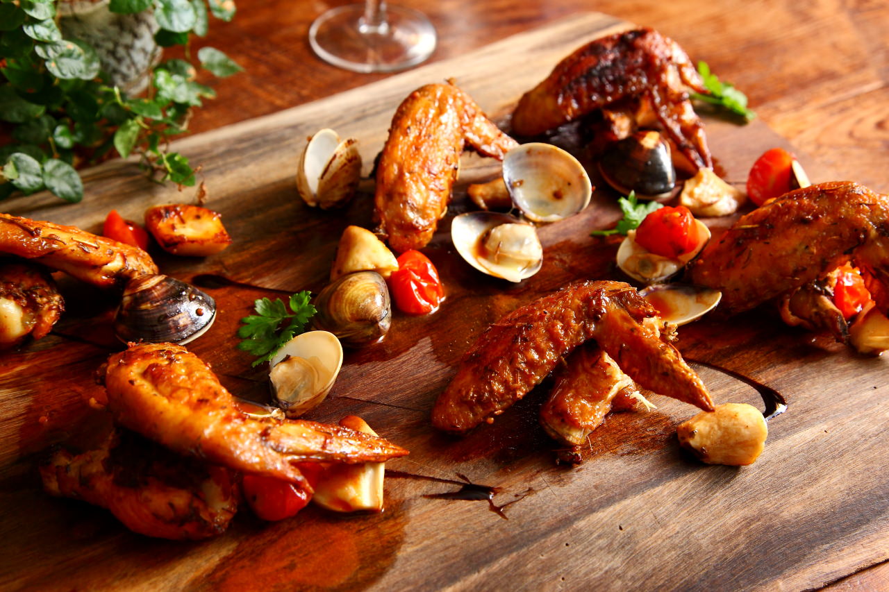 雞翅經過主廚的獨門醬料醃漬,使用真空的醃漬法讓醬料更加入味,再送入烤箱烘烤.出爐後淋上燒烤時滴下的雞汁與茄汁做成的醬料,雞皮表面看起油亮油亮,還散發濃郁的烤肉香味呢