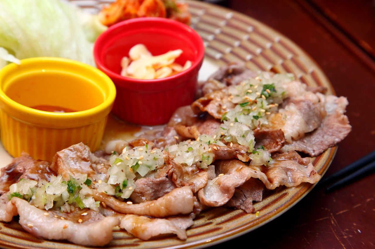 牛五花有附上生菜、蒜片、韓式辣醬及泡菜,牛五花經過炙燒後上面撒上鹽蔥及洋蔥末,看起來好像鹽烤牛舌喔