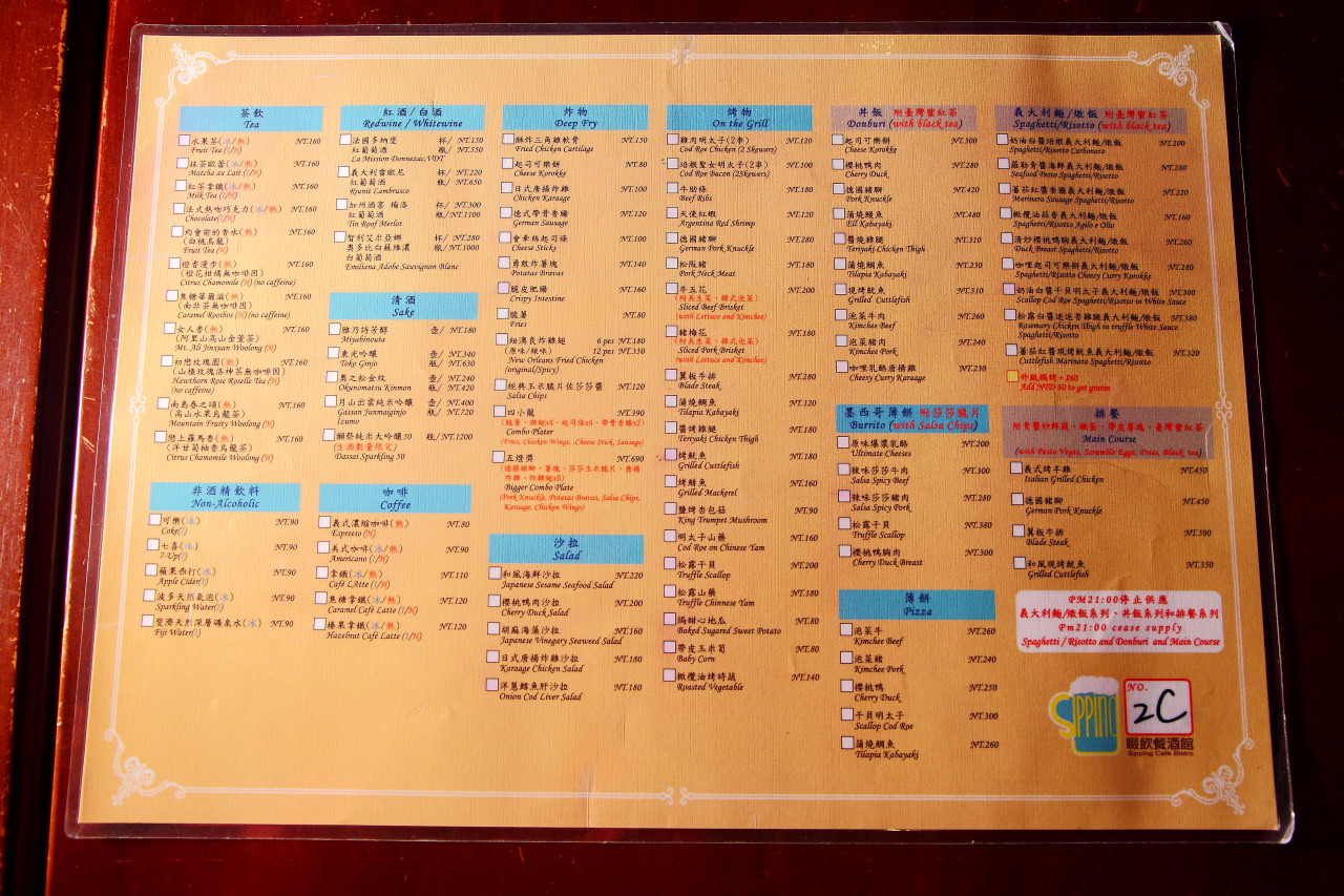 Sipping Cafe Bistro的菜單,品項相當豐富,有炸、物等下酒菜,想吃飽也有丼飯、義大利麵、燉飯可以選擇,來這約會?Sipping Cafe Bistro也有精緻排餐呢