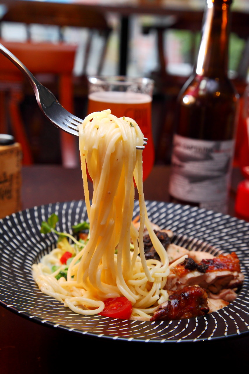 白醬義大利麵吃起來也相當滑順Q彈,這裡的白醬是走清爽路線,醬汁不會太過濃稠厚重,搭配重口味的松露雞腿剛剛好
