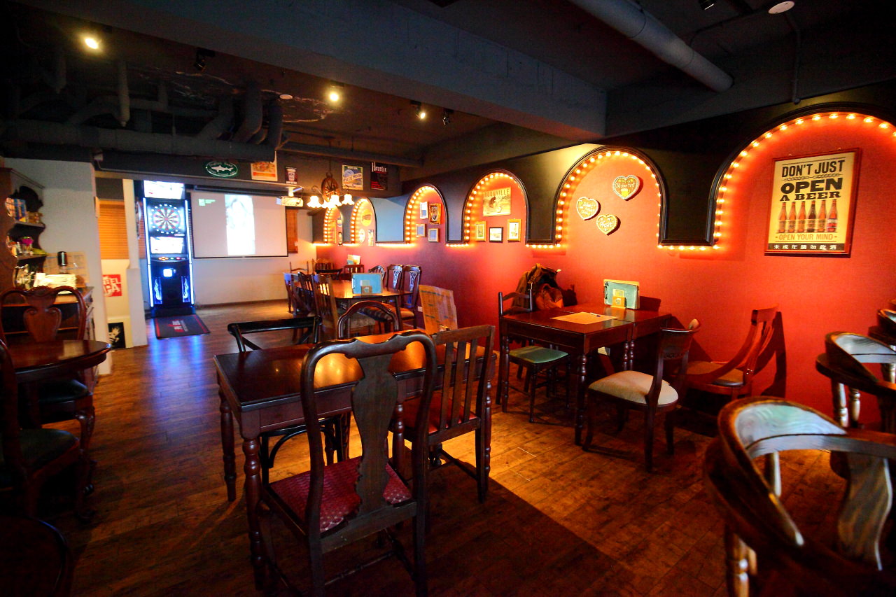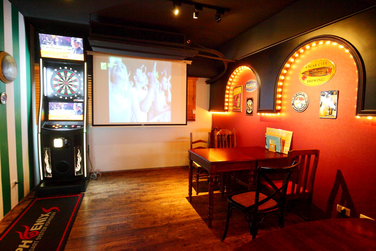 昏黃暖色調的燈光搭配木質英倫風家具,感覺到了歐洲的小酒館似的,白天來也很有FU!牆上的投影銀幕播放著節奏輕鬆的音樂MV,這裡還有提供鏢機,歡迎大家來這邊鏢個兩局!