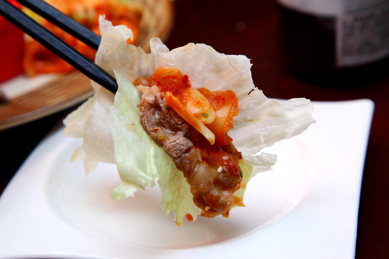 另一吃法就跟韓式燒肉一樣,用生菜包起牛五花、蒜片、泡菜,加抹上些許辣醬,吃起來極富口感層次,一口肉一口酒,舒服