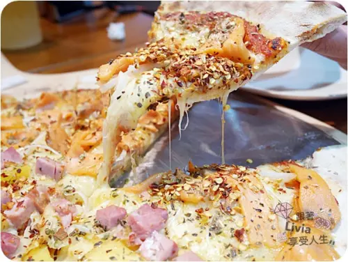 海鮮披薩餅皮是屬於薄片,裡面的配料有蝦仁和花枝,竟然還放了淡菜耶!味道很不錯,香濃的海味與起司香氣完全融合一起,薄餅好像在吃餅乾,脆脆的口感好涮嘴。