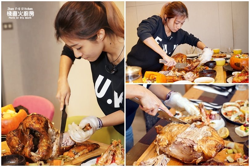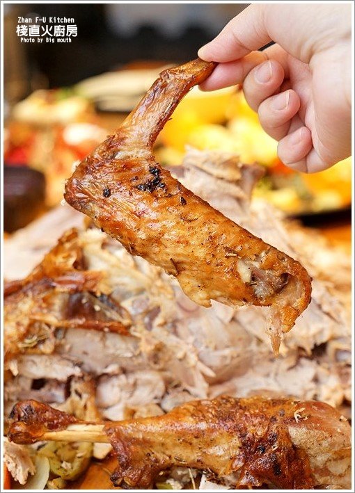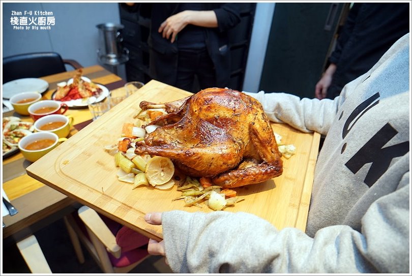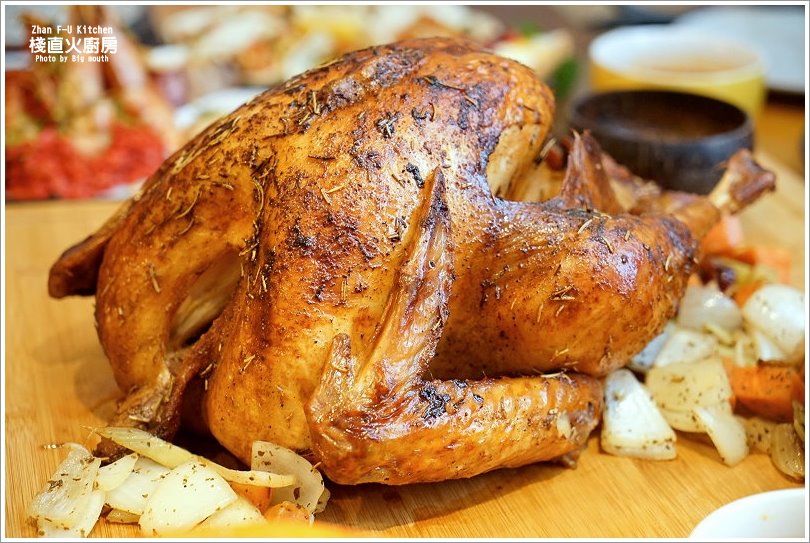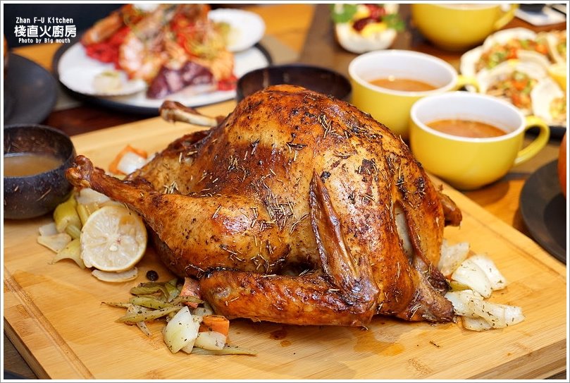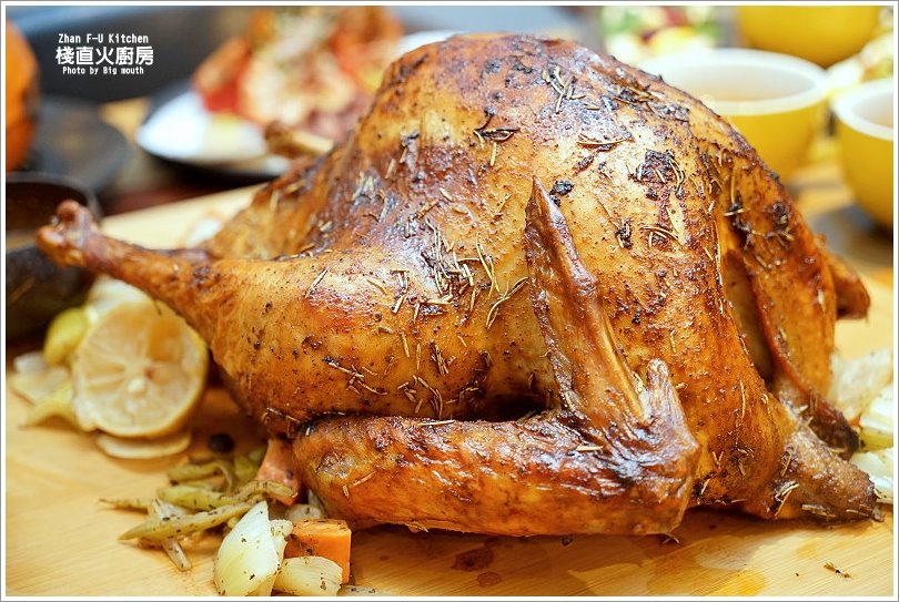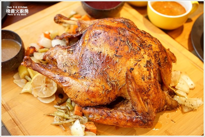 ▼八人份的餐點特別選用7公斤重的美國進口火雞,以西班牙紅椒粉、海鹽、黑胡椒、迷迭香、奶油塗抹內外後,肚子裡頭再塞入黃檸檬、洋蔥、西芹、紅蘿蔔、葡萄乾等,慢火細烤3小時~燒烤過程還得不斷澆淋火雞肉汁,才能呈現這般金黃焦香、香嫩動人的模樣啊!
