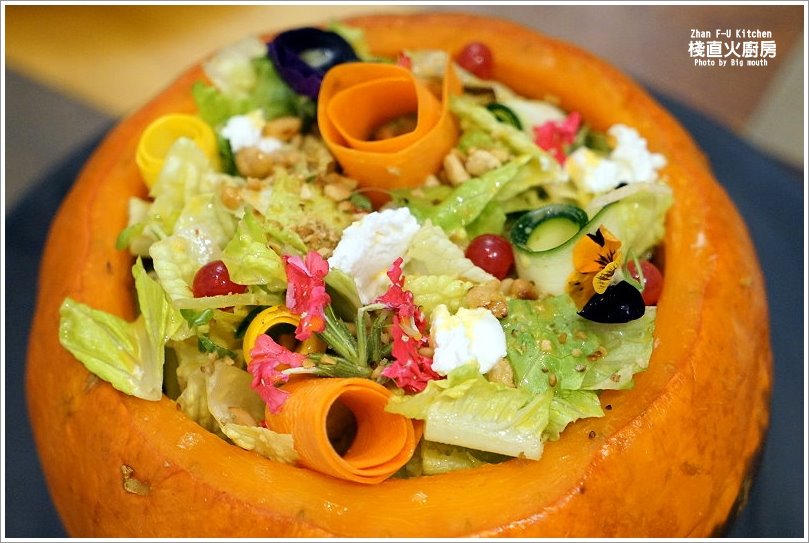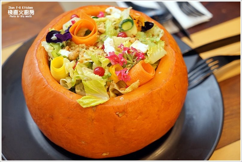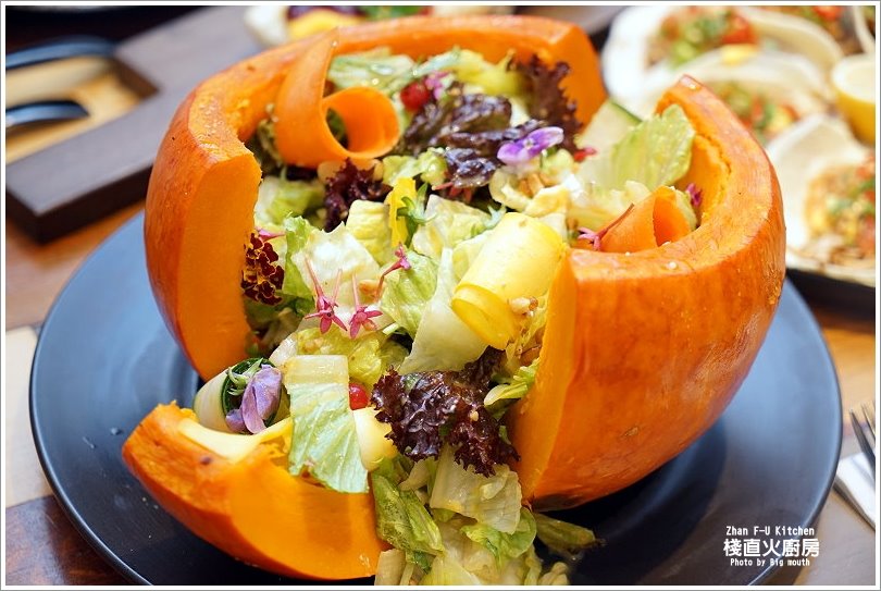 ▼南瓜搖籃沙拉,以橘紅的南瓜為容器盛裝各式各樣的生菜蔬果,感覺豐盛又飽滿!