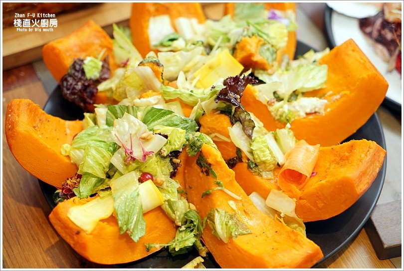 ▼因為天氣漸漸轉涼,所以店家特別做成有點類似溫沙拉的口感,爽脆的生菜加上香橙油醋醬汁不僅帶點微微酸香甜美,清爽又無負擔,加上細緻軟綿的南瓜更是香甜可口,吃完也相當有飽足感!