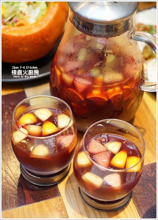 ▼飲品有西班牙水果酒(冰)、香料熱紅酒(熱)可供選擇(不適合酒精飲品的朋友也可以免費更換80元飲料一杯),我們選擇的是西班牙水果酒,以紅葡萄酒搭配柳橙汁、蘋果、柳橙、檸檬等水果切片下去調和而成,喝起來除了有甜美的微微酒香之外,還有各式酸甜果香,酒精味不會過於濃重,搭配在一起清爽順口,搭配餐點相當合拍!