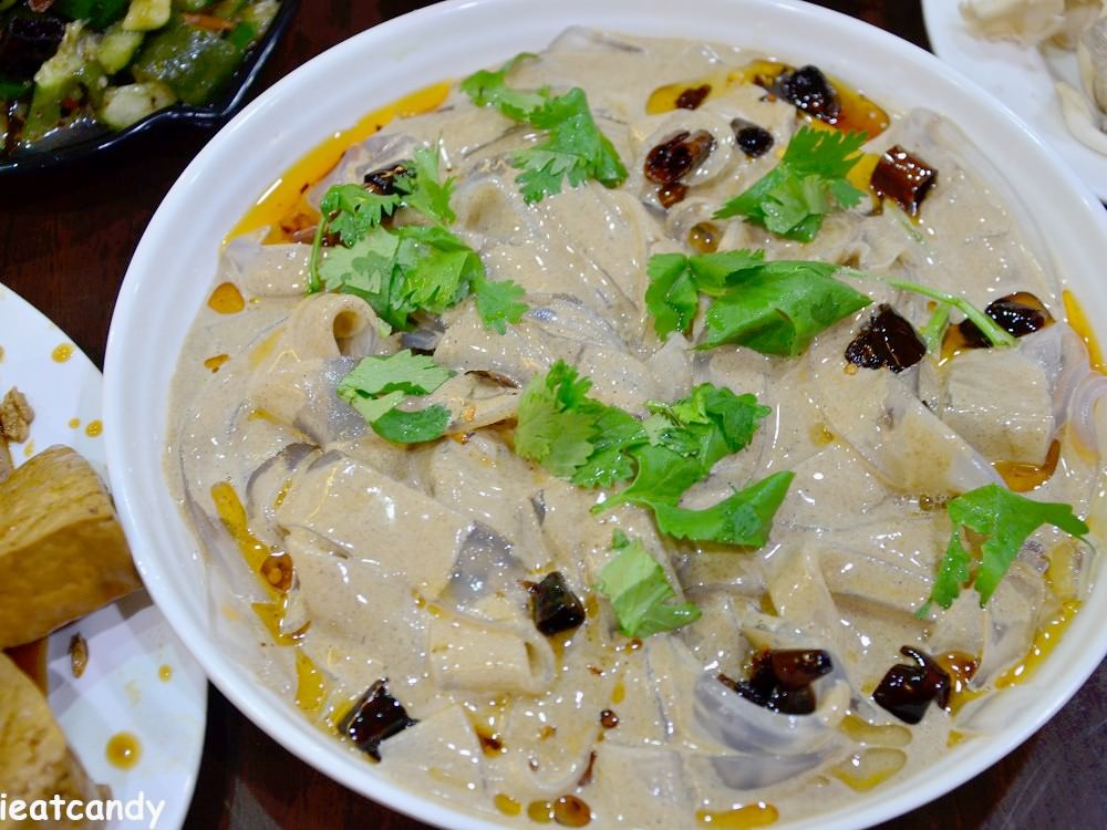 涼拌拉皮是個人還蠻推崇的一道,所有你看的到都是媽媽親手做的,拉皮是綠豆粉桿出來的、醬汁也是媽媽自己調配而成,麻醬給人印象中是較為濃郁、吃久會膩口,但是因為拉皮的Q度、微酸微辣的醬汁,中和了那感覺,越吃越涮嘴,媽媽建議在當場就要吃完,否則打包回家隔天吃就會硬掉不好吃囉~