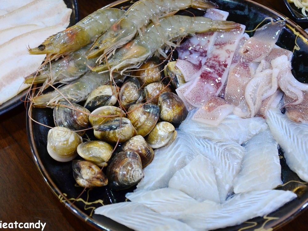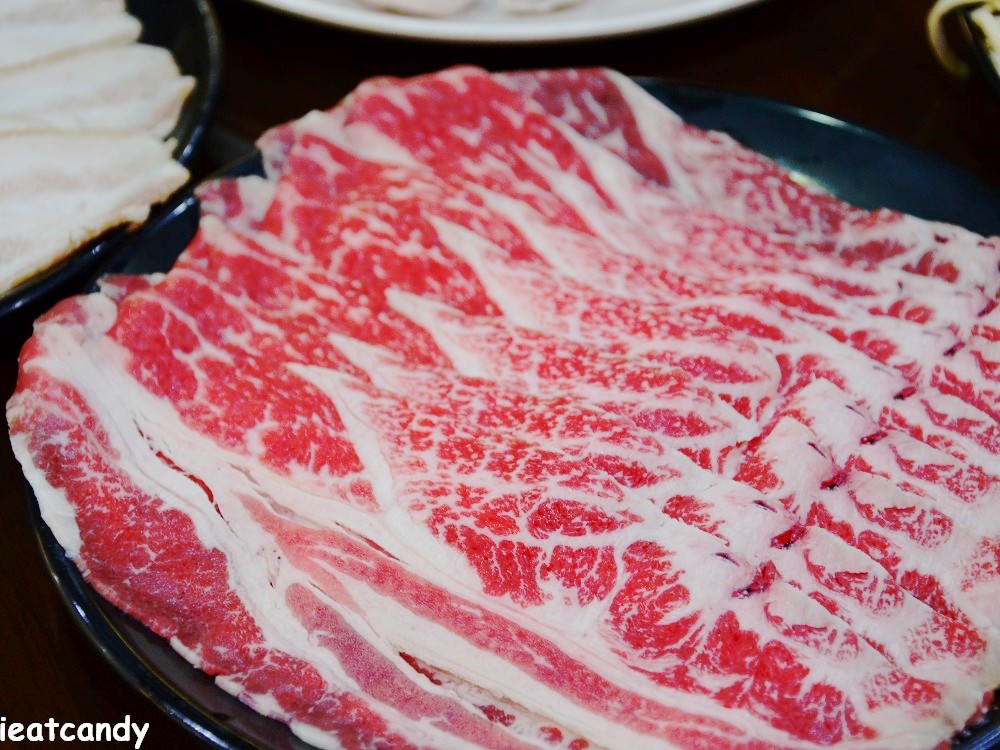 而以下皆為我們鴛鴦鍋的食材。海鮮盤、麻辣鴨血、蔬菜、綜合菇、滷豆腐、白肉、綜合丸等,還附上了一盤油花漂亮的雪花牛肉片。