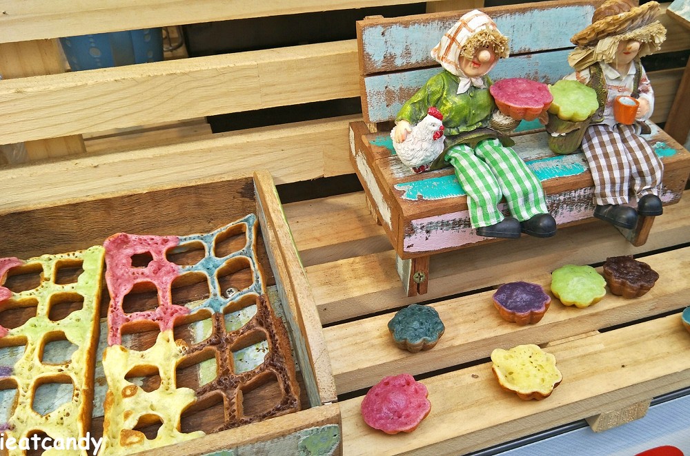 色彩繽紛的彩紅燒一一在架子上,看起來就非常的舒服、療癒~感覺有個手邊小出氣包一定大賣!我看網路上說格子燒比彩虹燒來的更好吃,不過我們是吃完午餐才過去的,肚子還非常有飽足感..(汗)