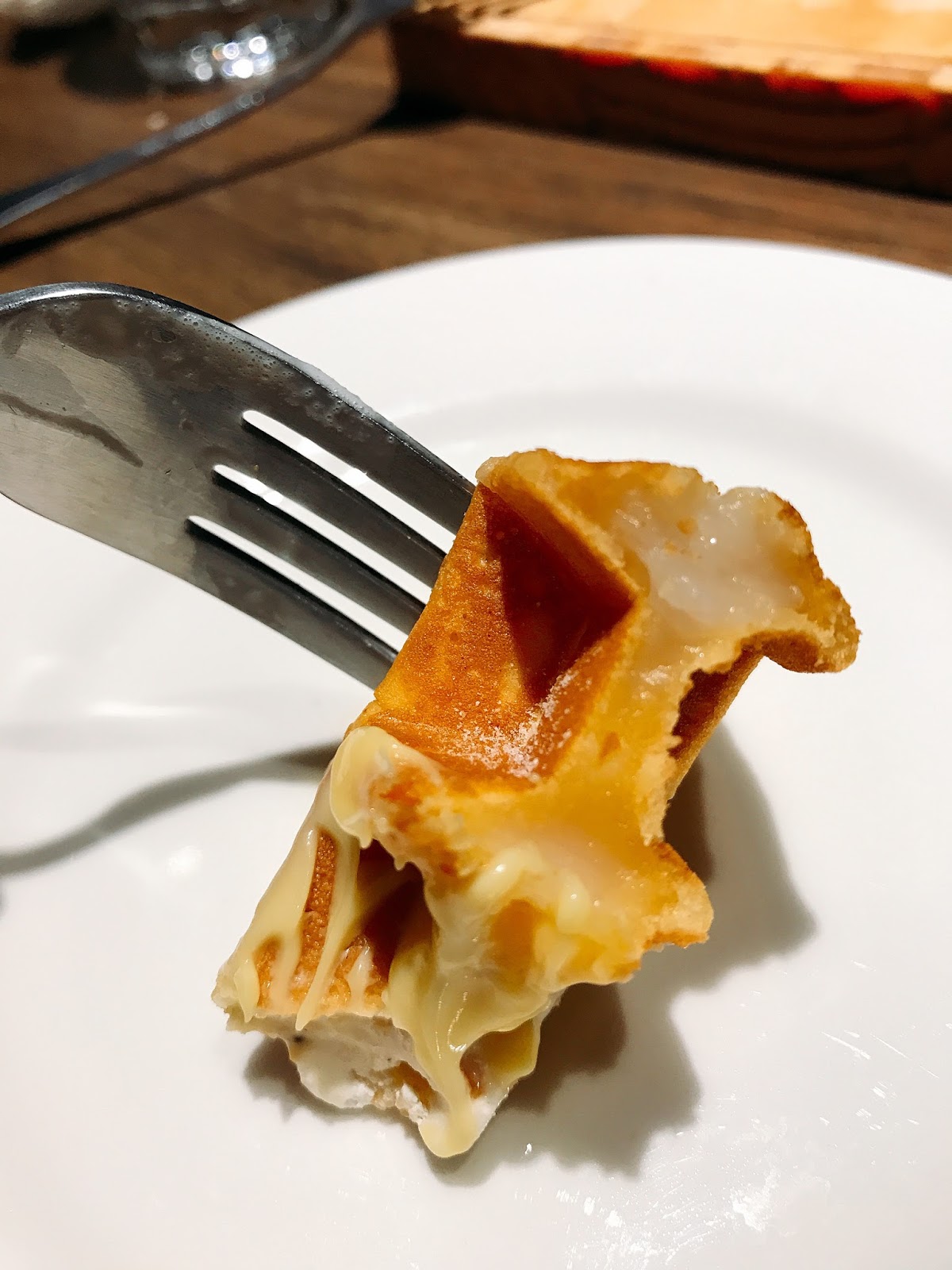 鬆餅切三角,內層有夾麻糬,口感甜甜QQ