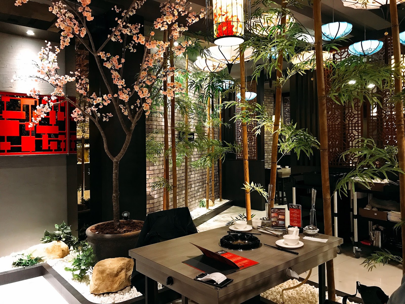 採取梅花跟竹子搭配,搭上深色調的桌椅