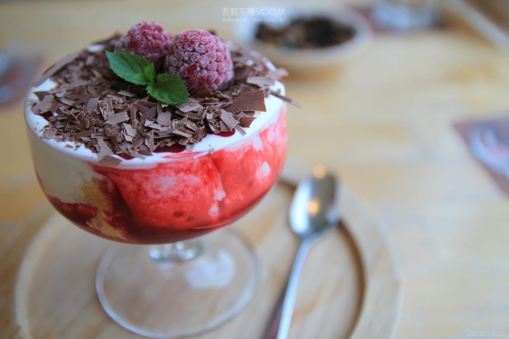 巧克力碎片底下藏著的是由馬茲卡彭起司與覆盆子果醬調和而成的餡料