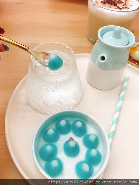 氣泡飲是使用雪碧放進富士山形狀的杯子,可以將富士山珍珠從碟子撈起,一顆顆放入杯中,富士山糰子Q度沒有比柴犬糰子好,入口時有種說不上來的薄荷味道,滾媽個人是不太喜歡