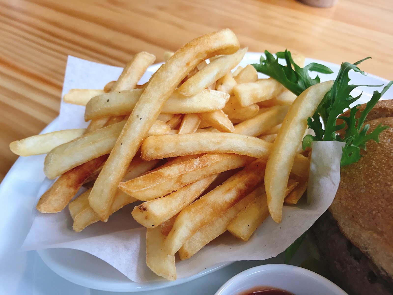 剛上桌的薯條還熱騰騰的,吃起來表層香脆但內層仍保有馬鈴薯的鬆軟口感,趁熱沾著番茄醬吃很美味。