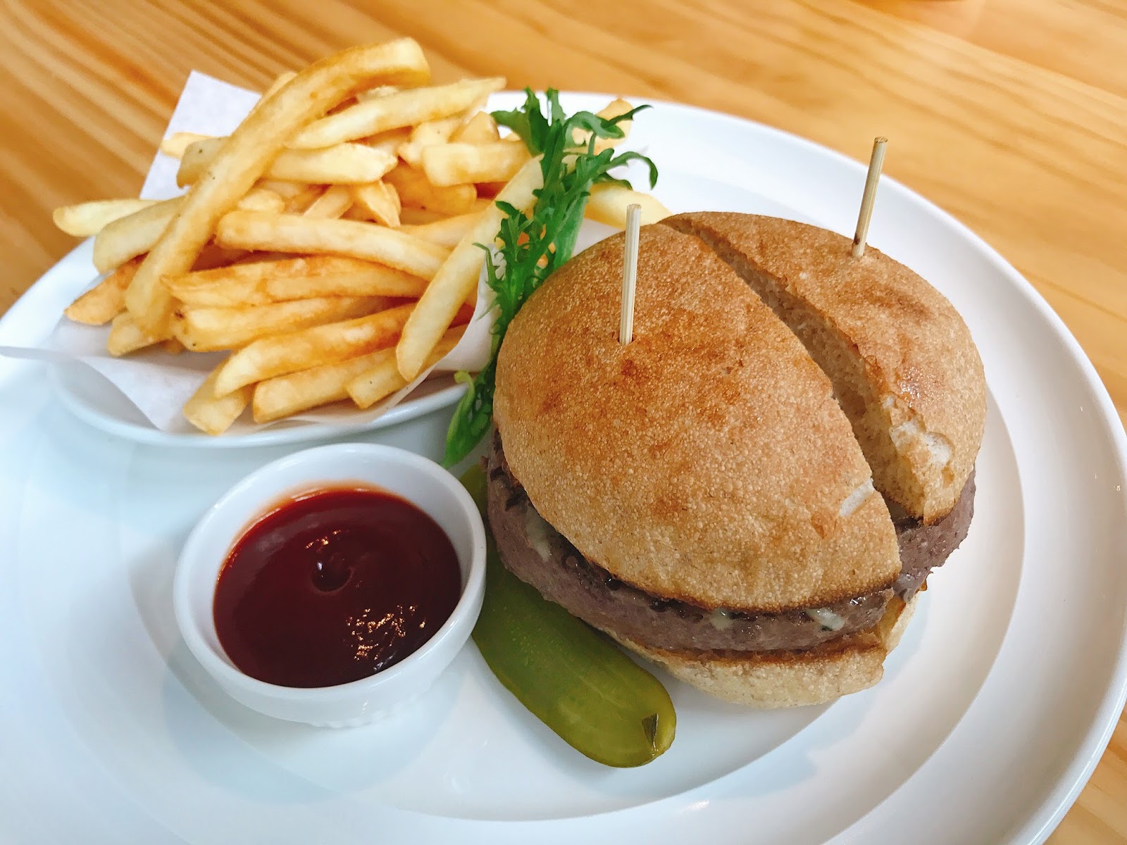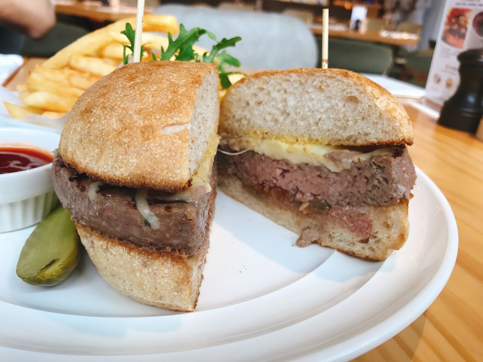 漢堡的麵包口感鬆軟有彈性,牛肉的份量不少,吃起來很柔嫩、肉汁豐盈,當中的格魯耶爾起司融化在牛肉上面,墊著底層的番茄,三者融合在一起的味道還不錯,但幾乎沒有鹹度,可依自己口味再酌量撒上鹽和胡椒。