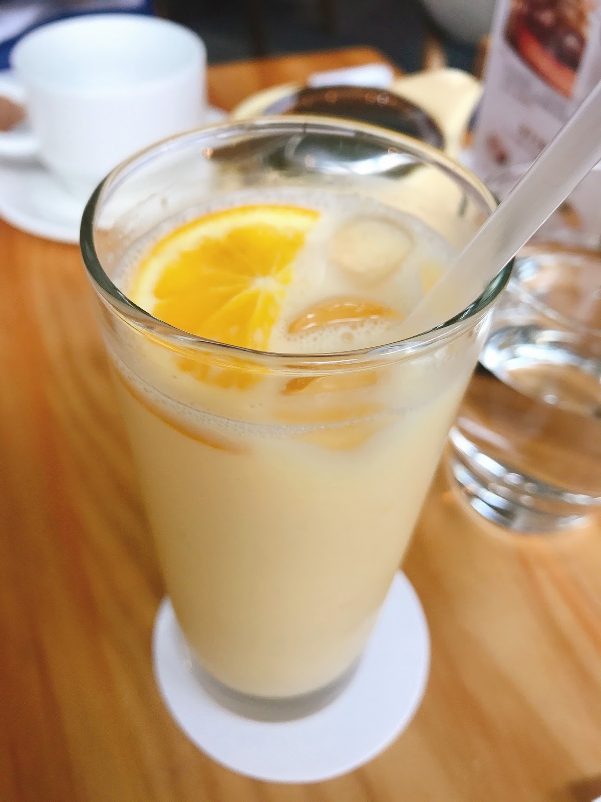 柳橙果露喝得到柳橙的果粒,牛奶的滋味蠻明顯的,融合在一起有種酸酸甜甜的優酪乳滋味!