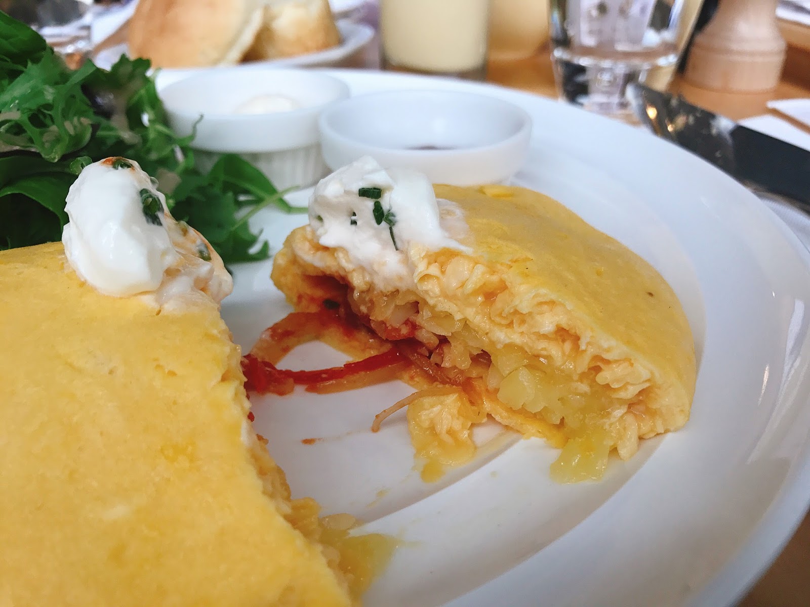 晨光紅蛋捲用小火煎得很柔嫩,內層的番茄和上面的酸奶將雞蛋的滋味帶出來,選擇搭配英式馬芬,可塗上奶油和濃郁的果醬一起吃還蠻香的,雖然說英式馬芬口感完全不是傳統英式馬芬的樣子。