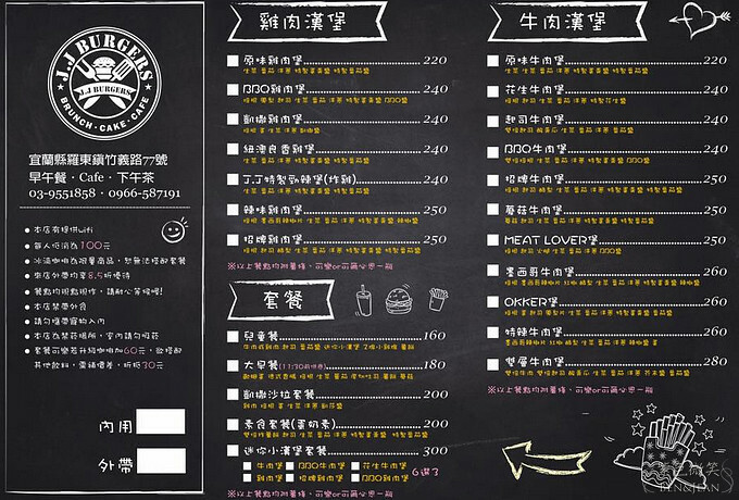 J.J burgers 美式漢堡 顧名思義就是賣漢堡的啦! 這家位於羅東的竹義路,上門光顧的那天,一進門就感受一股濃濃的美式風情,裏面還有超大的花牆可以拍照,而且對我們有小孩的父母來說,這裏有個遊戲室,對我們來說可是天堂啊!哈哈哈~大人可以坐在一旁慢慢聊天,小孩可以惠心玩耍,真的太棒了!! 當然囉,這些都是餐廳的附加功能,餐點還是最重要的啦,那天嚐的墨西哥牛肉漢堡(算是宜蘭少見的)及友人嚐的雞肉漢堡都令人難忘,這裏的份量已經夠多了,老闆竟然說薯條不夠可再續哦!!真的超佛心的!!