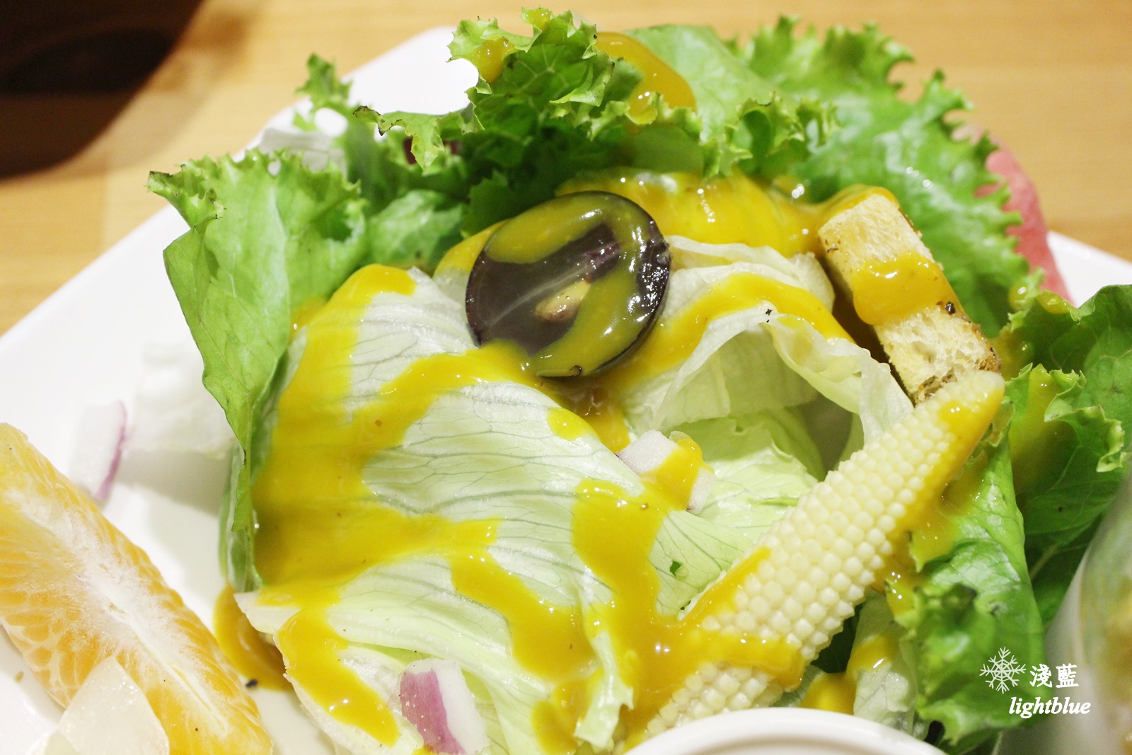 沙拉可選蜂蜜芥末或油醋,我選了店家自己調配的蜂蜜芥末,質地上沒使用那麼多美乃滋,黃芥末味鮮明但不辣,香氣可以蓋掉生菜的味道,沙拉除了生菜之外還有一些水果,更添多樣性