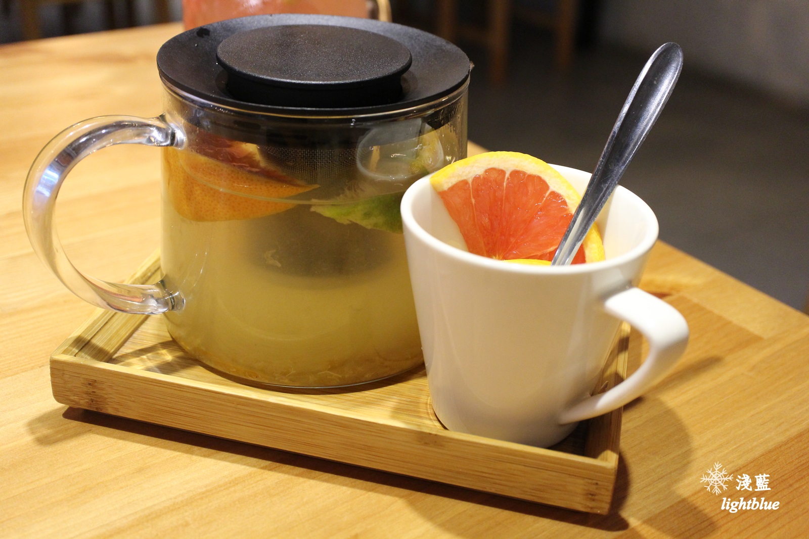 甜柑橘綠茶是熱飲,喝得到葡萄柚和檸檬的柑橘酸味與香氣,茶葉似乎是包種茶,帶有一股清香