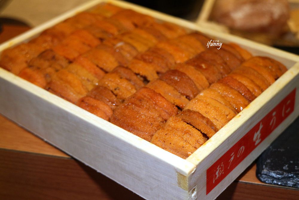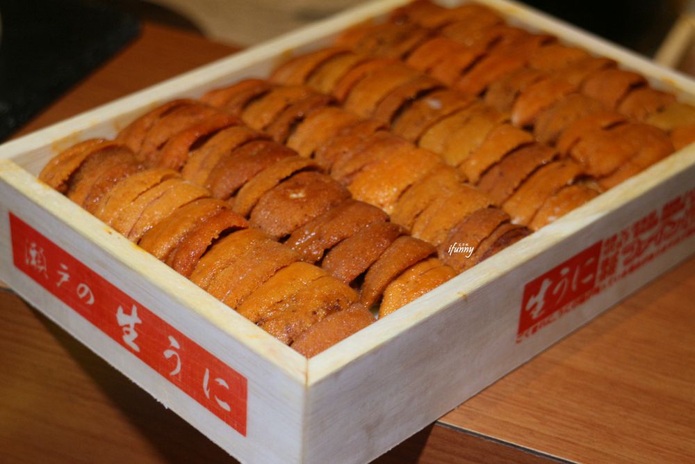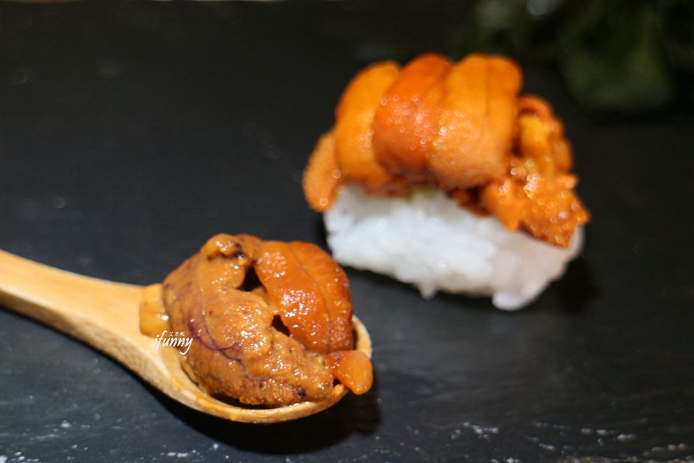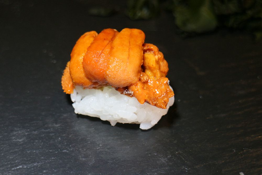 這才是當天套餐中配的海膽,比起剛剛的生海膽來得更濃郁,一入口立即被口中的溫度融化於無形,經咀嚼醋飯的同時卻又帶出甜味,整個幾乎是要將舌頭吞下的美味啊!