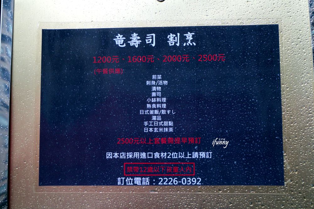 門口放置著用餐規則,竜壽司採完全預約制,套餐價格為1600、2000、2500元(酌收10%),2500元以上套餐,需於三日前預訂。