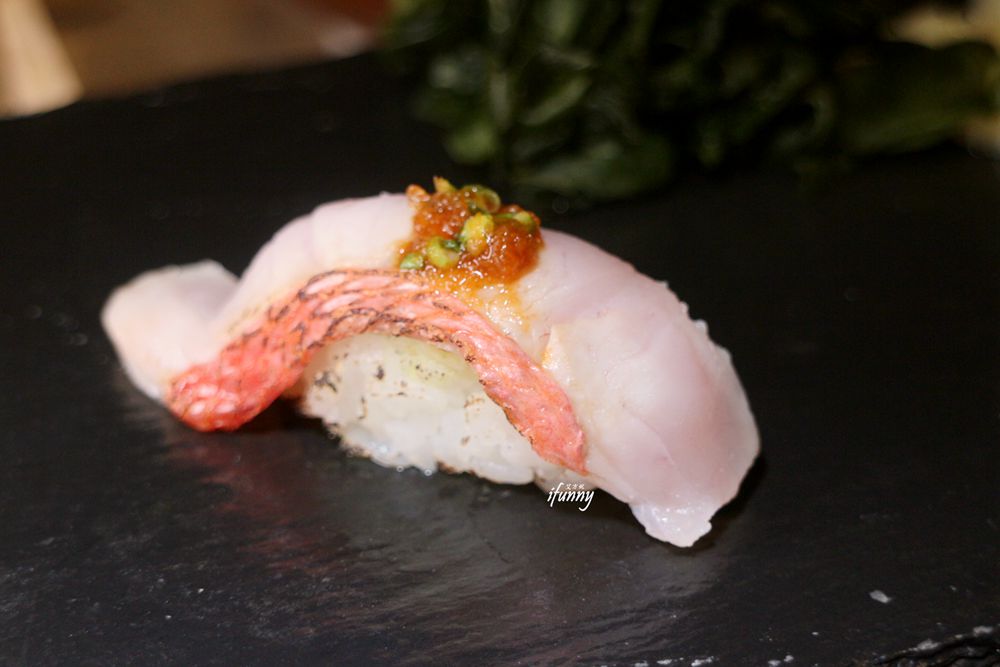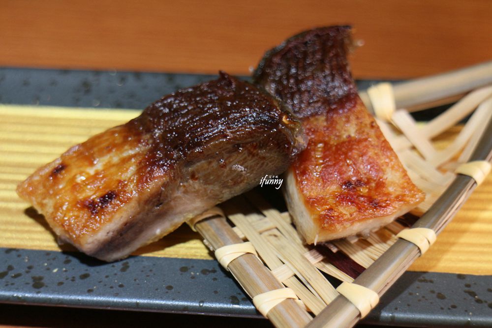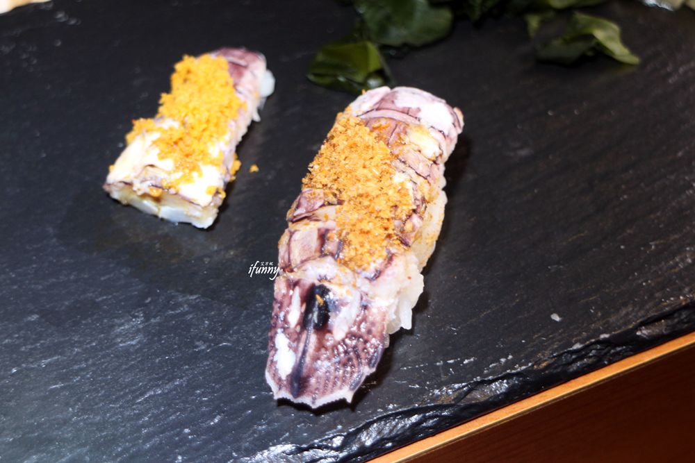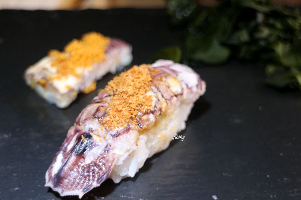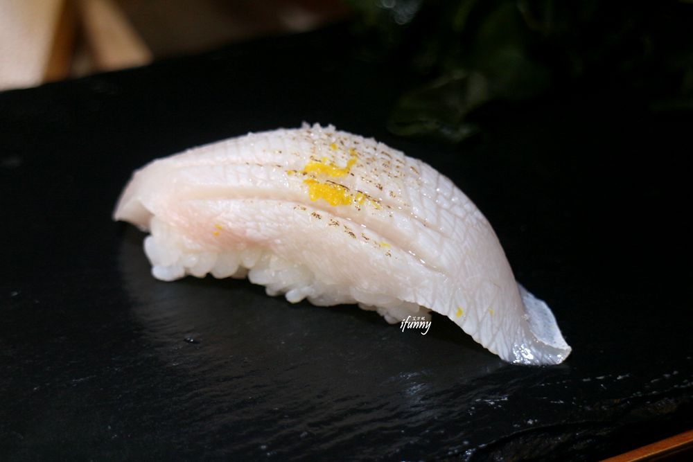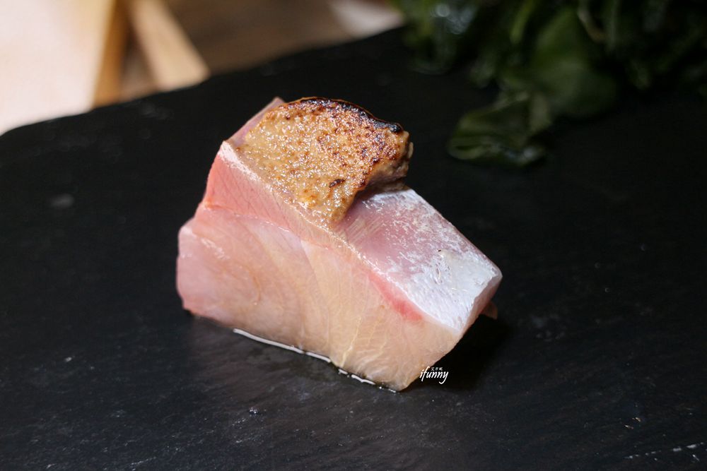 清爽的握壽司之後,阿龍師傅取鰤魚背部,其上是炙燒過的魚肝。友人在一入口後,立即驚呼了一下。原來新鮮無比的魚肝竟然一點腥味都沒有,入口即化的的甘甜,加上有口感有油香的魚肉,搭配出令人驚喜的口感。