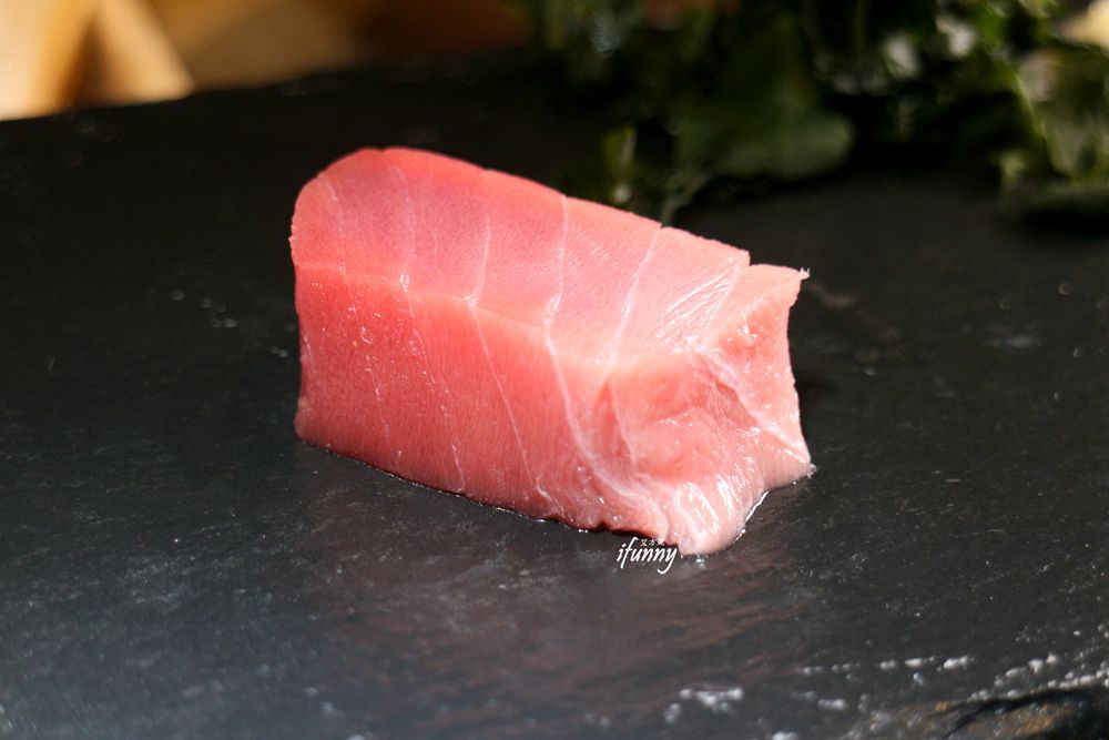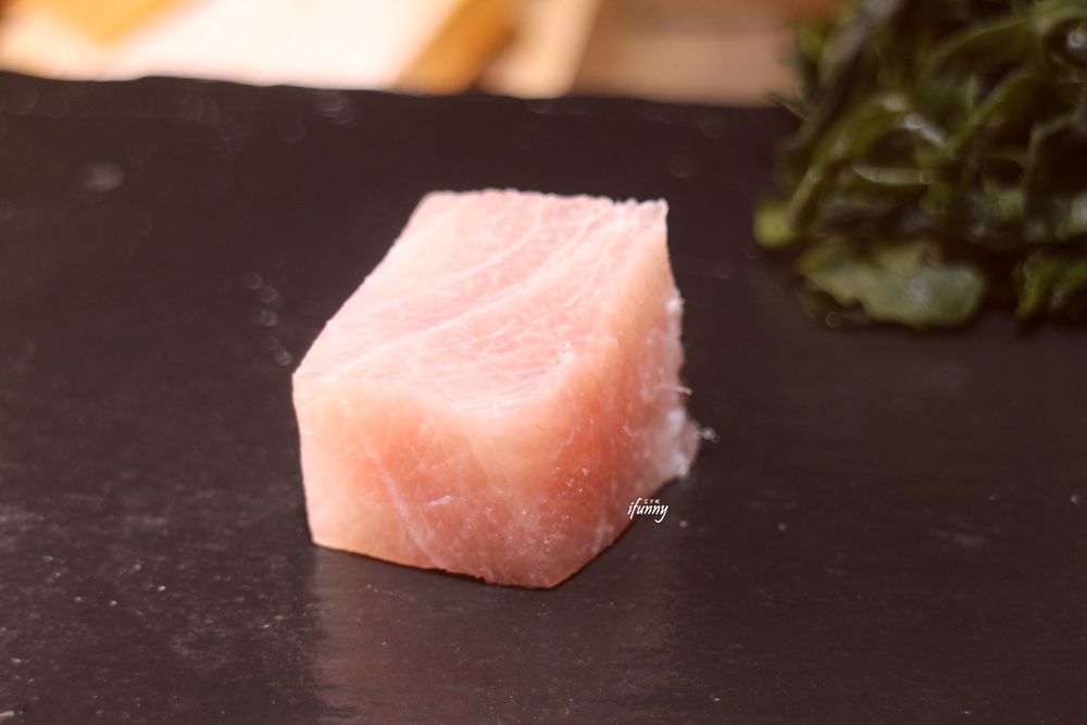 採日本愛媛縣本鮪中腹,所謂的<本鮪>才是真正的黑鮪魚喔!香氣明顯,一口放入嘴中,魚肉的甜及香完全在口腔中散發。本鮪>