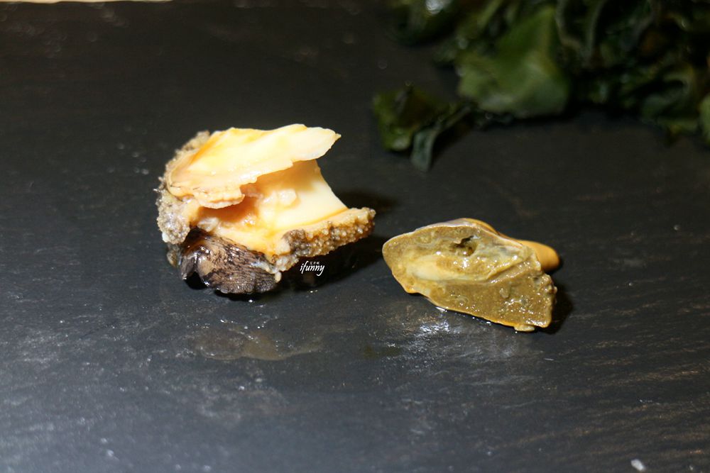 阿龍師傅除了一般加醬油的作法,還加入了昆布湯汁磯煮鮑魚,肥美的鮑魚連同內臟一起呈現。這要不是夠新鮮的話,這內臟該是沒人敢吃的吧!沒有內臟該有的腥味及苦味,細綿的口感與帶著彈性的鮑魚搭出絕妙滋味。