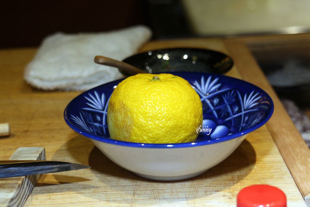 這天的是冬鰤魚腹,以肉眼就可辨識其脂潤之處,以刀切細紋微炙燒,再加上柚子皮及沖繩海鹽。油脂豐富的鰤魚在柚子及海鹽的提點下,入口的香氣變得很優雅。