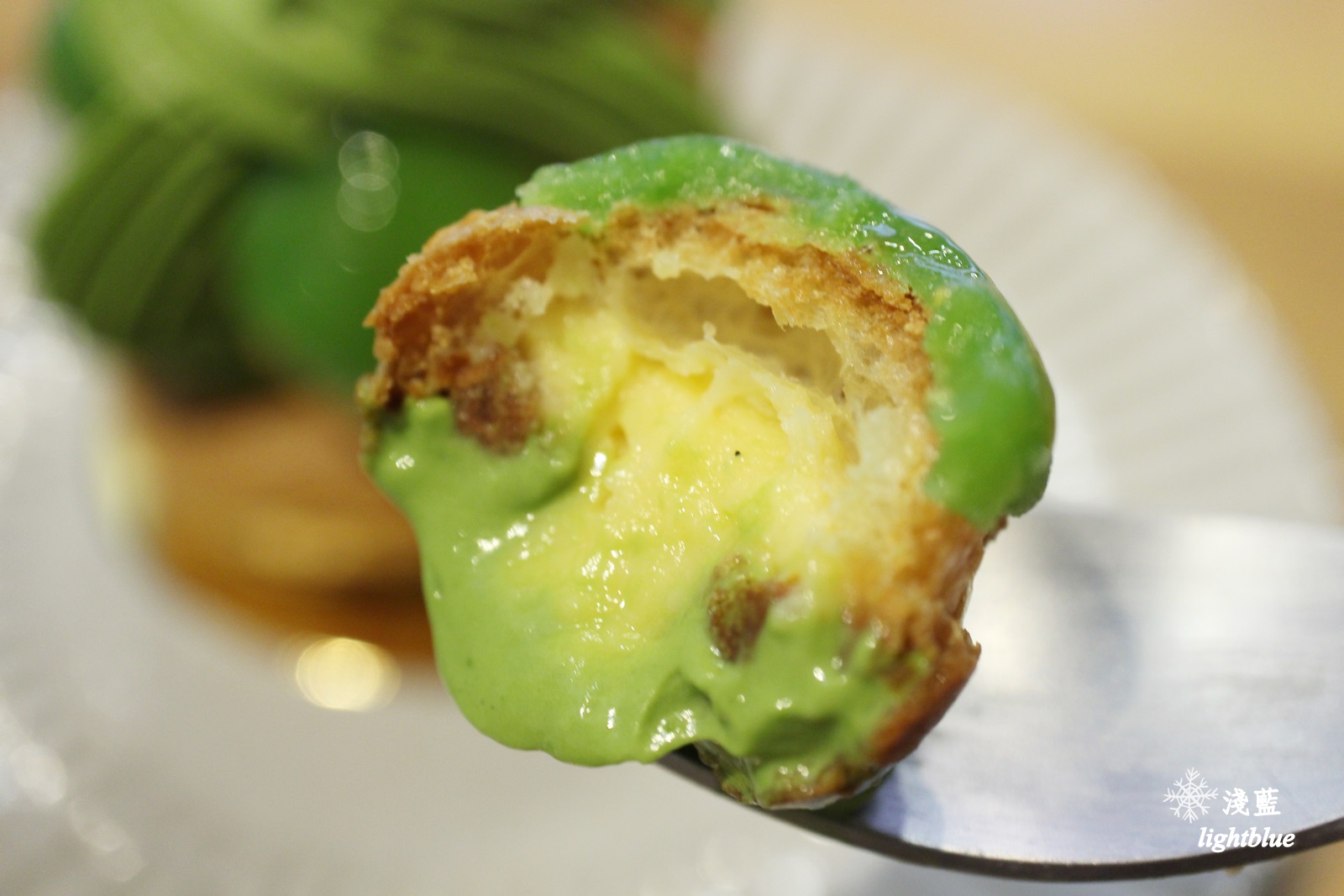 抹茶香緹趨近無糖,但似乎也因此襯托不出抹茶的香氣,跟小泡芙裡頭的原味卡式達一同入口,只覺得有股苦味,我反而喜歡底部更多些,有香酥口感跟怡人的微甜。