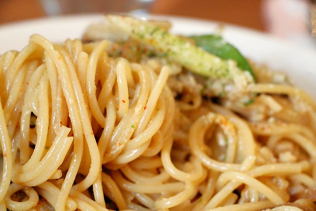 麵條吸附了和風醬汁,一入口有點像是在吃炒麵的錯覺,雖有微微的辣度卻因為醬汁而轉為溫和舒適,麵條本身有Q度,這才整個把我拉回義大利麵的世界裡,不得不說這麵條很對阿關的胃。
