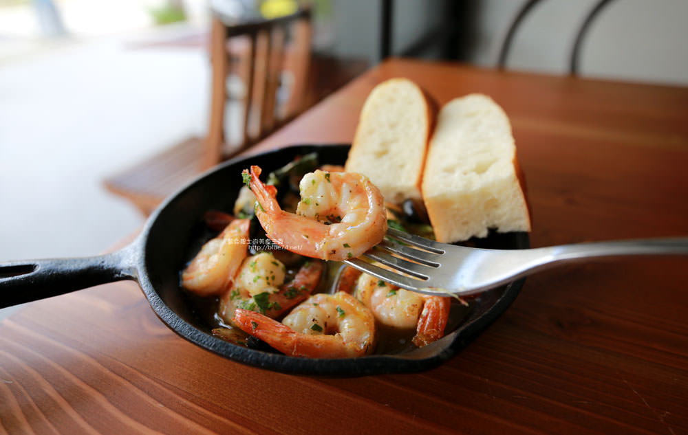 蒜味蝦附有2片麵包,沾點底下的醬汁就很讚