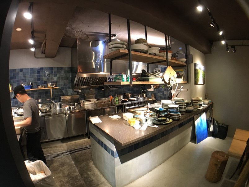 餐廳內空間寬敞舒適,大致分為左右兩部份,右半部為主要廚房、吧檯。