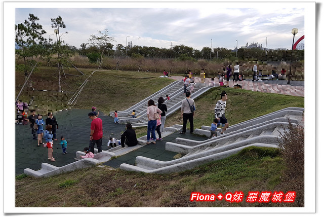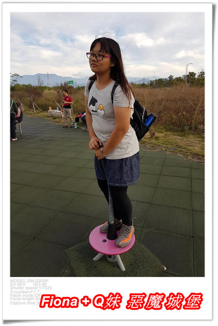 這個可以旋轉的器材,我們沒在其他地方見過,Fiona比較高大,可以直接站在上面轉,Q妹比較矮小,則讓她坐著轉,我想轉很快應該會頭暈,不過倆小孩挺喜歡這遊戲的 !