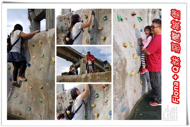 離開公園之前,順路來到攀岩區,這裡有一整面的攀岩牆,可以容納好幾個人一起爬,這應該是大人小孩都能玩,只要你能爬得上去.....哈哈.....