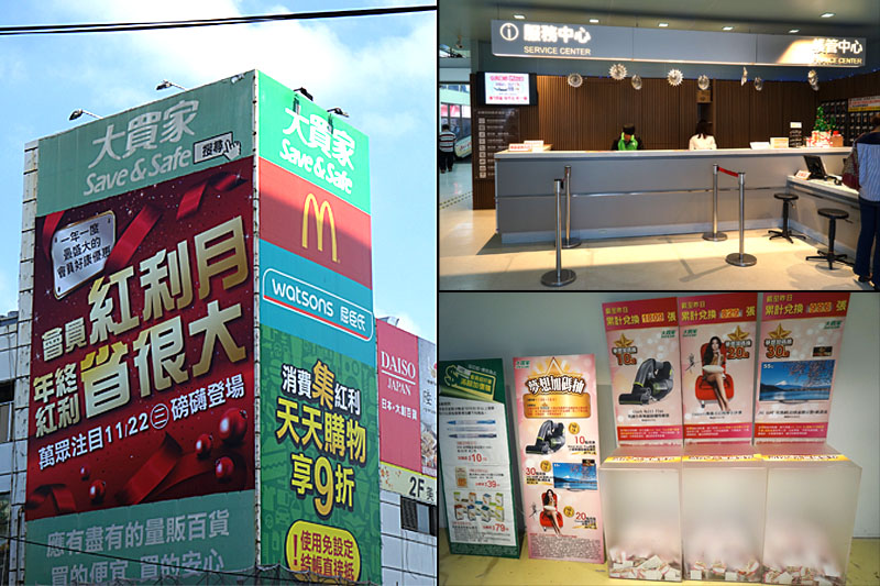 每一年大買家都有年終紅利活動,身為大買家的會員一定不可錯過,還沒進入前就可以看到這超大的廣告刊版,紅利月折現金省很大,應有盡有的量販店,買的便宜買的安心,一進門口就可以先看到服務台,當然可別錯過12月的重點活動,有看到右下角的摸彩箱了嗎?都可以用紅利換摸彩券,選擇要抽小綠吸塵器、謝金燕代言的舞動天后按摩小沙發又或是55吋的液晶螢幕。