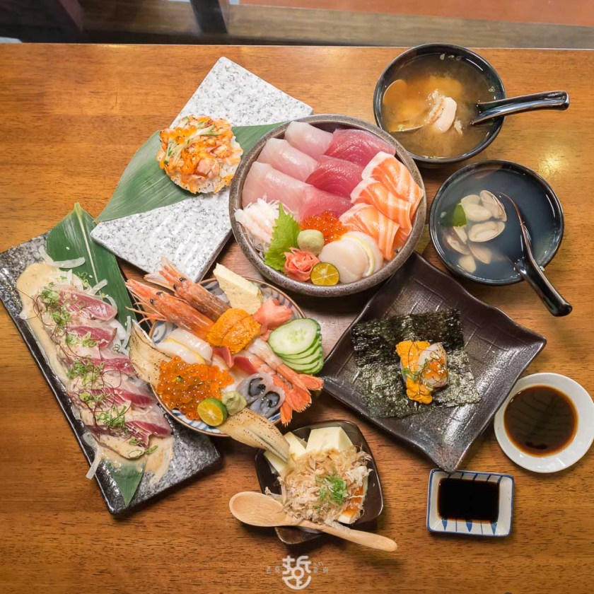 生魚片有旗魚、鮪魚、鮭魚、北海道干貝、小甜蝦以及鮭魚卵。生魚片切的相當豪邁,每一片都很厚實。漁獲來自於屏東東港直送。
