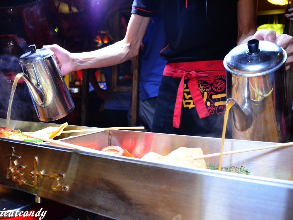 店員一次將兩種湯頭注入長型火鍋中,覺得療癒~~