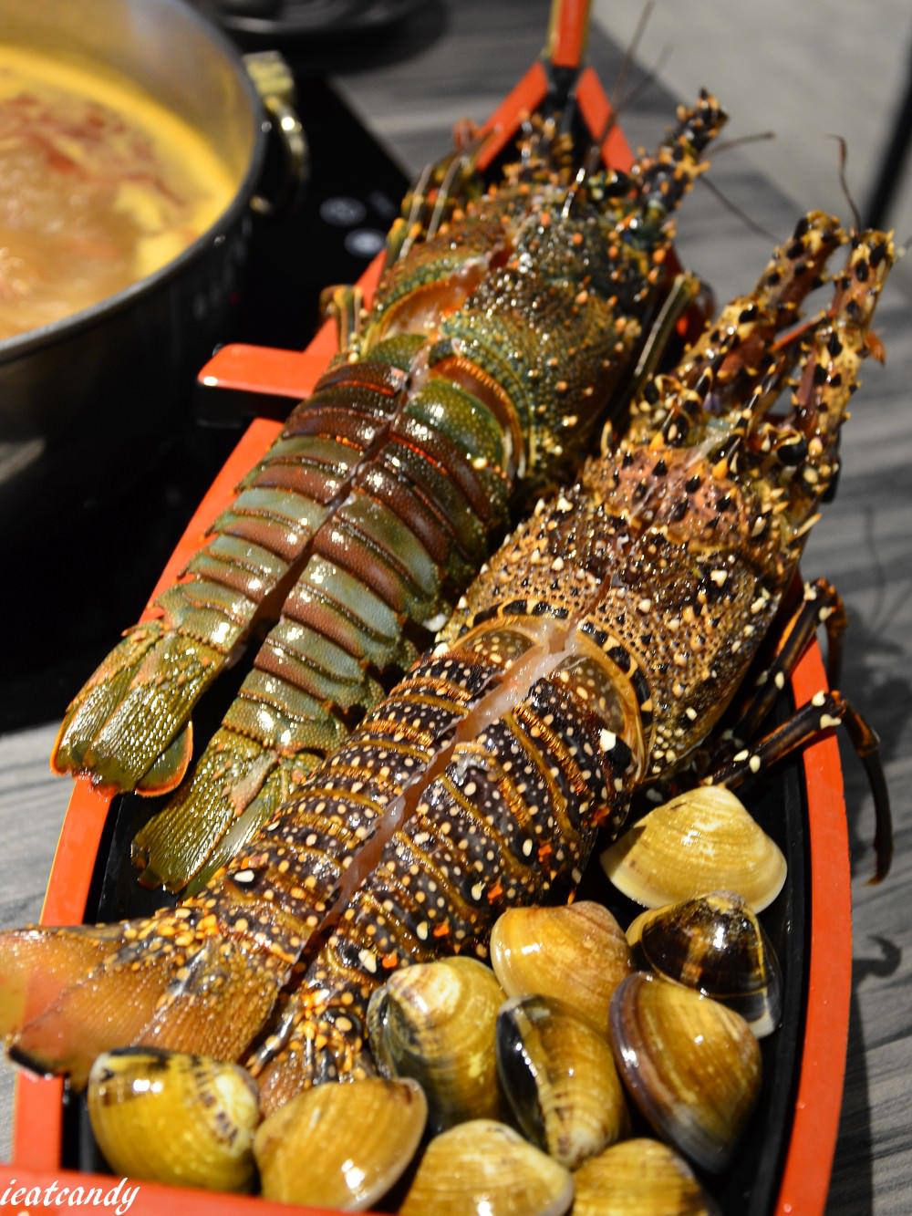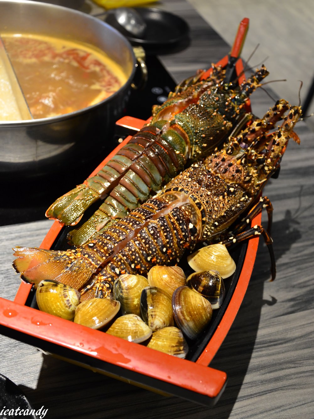 接著,再次讓小男孩驚訝的小龍蝦登場了!這是小龍蝦嗎?也太不小了吧!我老公從一送來就眼盯著,恨不得立馬吃了他們,龍蝦肉質很緊實、Q彈,單吃就能吃到鮮甜味。旁邊還有些許蛤蜊,放入湯底可以增加鮮味~