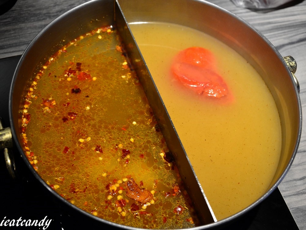 可以選擇兩種鍋底,愛伊特選了番茄味噌及麻辣湯底(有添加牛油),番茄讓味噌增添了微酸的風味,喝起來帶點清爽感,第一次品嘗。麻辣湯底老公覺得是可以喝的那種,中藥味不會太重,拿來涮肉很不錯。