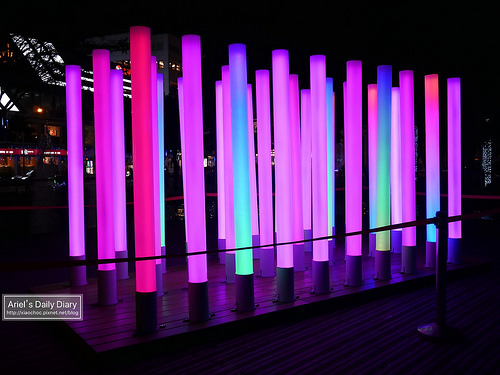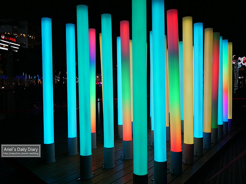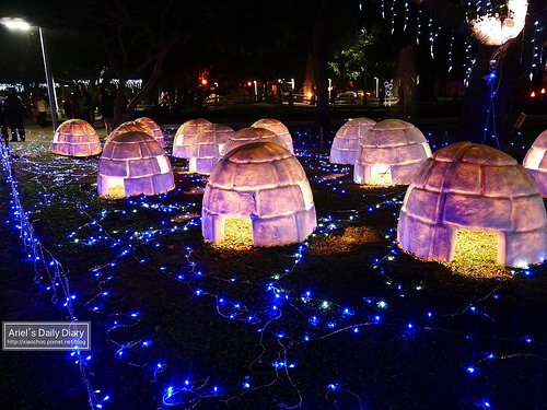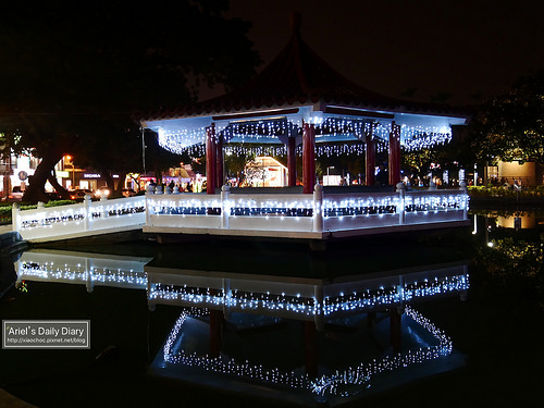 連原本公園內的涼亭也都繞上滿滿的燈飾,倒映在水中的影子也很美
