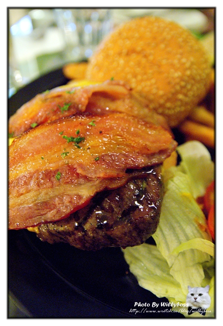 由照片中可以看出真的是整塊炭烤的牛排,不過口味和口感上有些可惜的地方;首先用整塊牛排而非漢堡肉,大口咬下的時候整塊肉的韌度是比較難咬開的,加上牛排的原汁原味被起司和蕃茄酸黃瓜等等重口味的配料蓋過也很可惜,只能說用料雖然扎實,但是實際上的搭配還需要再多調整會更好,不過大口吃肉的感覺還是超爽。