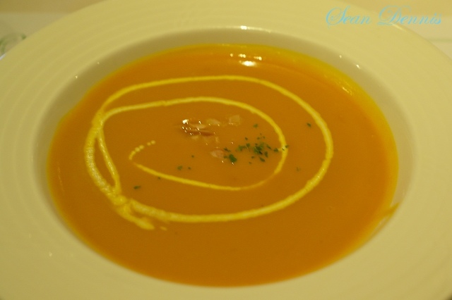 法式堅果南瓜湯:上面放些許的杏仁片,湯的濃度適中,味道和一般家庭煮的差不多,都會有些許酸酸的味道