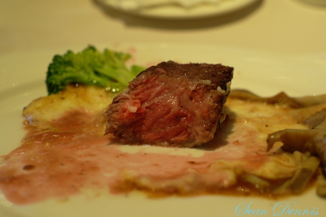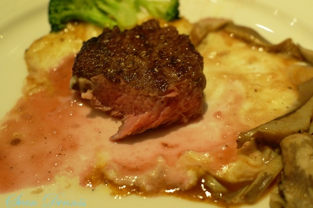 爐烤美國沙朗牛排(五分熟):這塊肉很少油脂,所以不能吃太熟會太柴,外層酥酥香香較乾澀硬,中間剛好,吃起來有肉汁,牛排可能沒有靜置,所以切肉時肉汁一直流出來