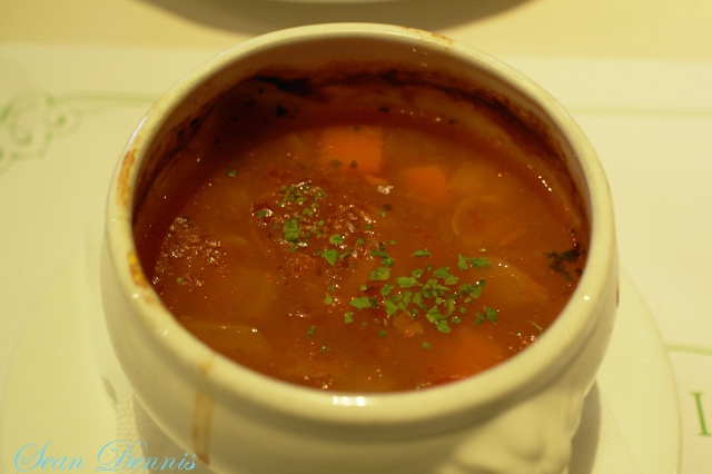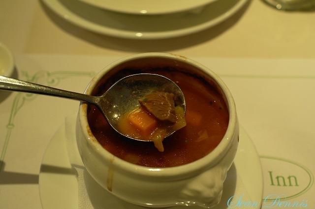 經典蕃茄羅宋牛肉湯:喝起來感覺像喝溫的可果美番茄汁,微微酸,應該沒加糖完全喝不出甜味